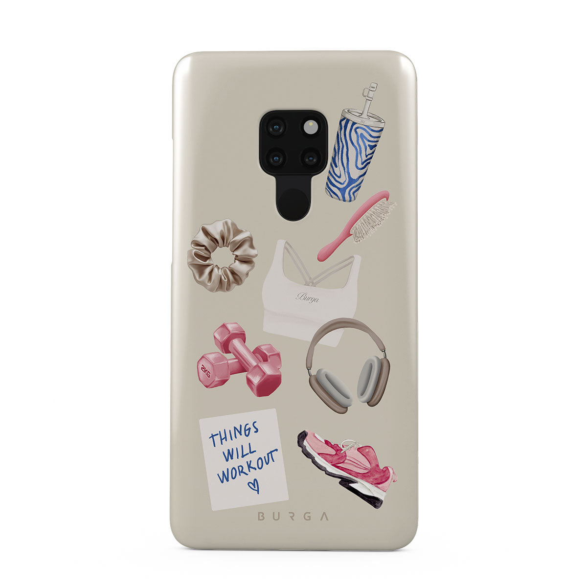 En este diseño: pesas, auriculares, termo, cepillo para el cabello, zapatillas rosas, sujetador deportivo, barrita Crunchie, nota adhesiva "Things Will Work Out".