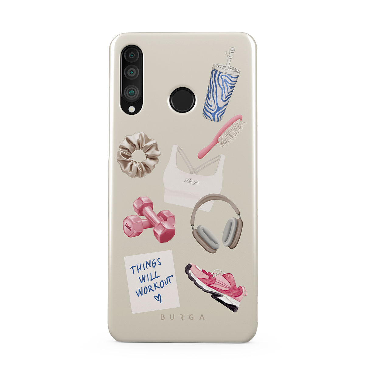 En este diseño: pesas, auriculares, termo, cepillo para el cabello, zapatillas rosas, sujetador deportivo, barrita Crunchie, nota adhesiva "Things Will Work Out".