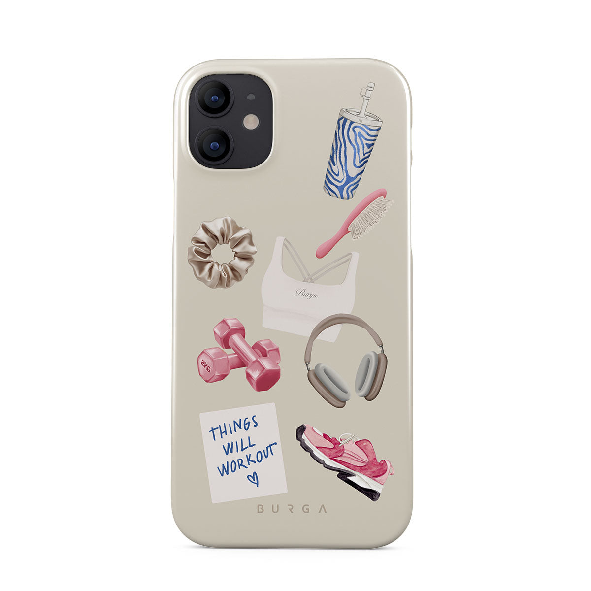 En este diseño: pesas, auriculares, termo, cepillo para el cabello, zapatillas rosas, sujetador deportivo, barrita Crunchie, nota adhesiva "Things Will Work Out".