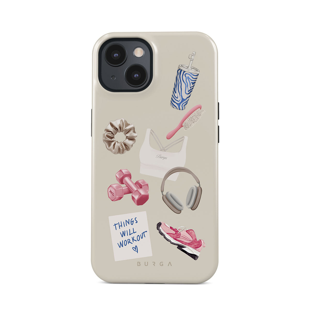 En este diseño: pesas, auriculares, termo, cepillo para el cabello, zapatillas rosas, sujetador deportivo, barrita Crunchie, nota adhesiva "Things Will Work Out".