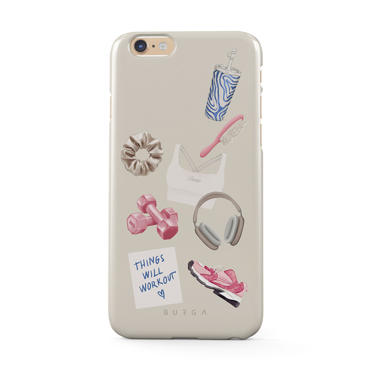 En este diseño: pesas, auriculares, termo, cepillo para el cabello, zapatillas rosas, sujetador deportivo, barrita Crunchie, nota adhesiva "Things Will Work Out".