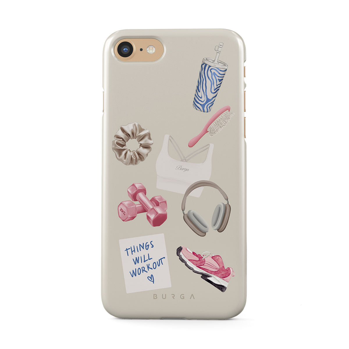 En este diseño: pesas, auriculares, termo, cepillo para el cabello, zapatillas rosas, sujetador deportivo, barrita Crunchie, nota adhesiva "Things Will Work Out".