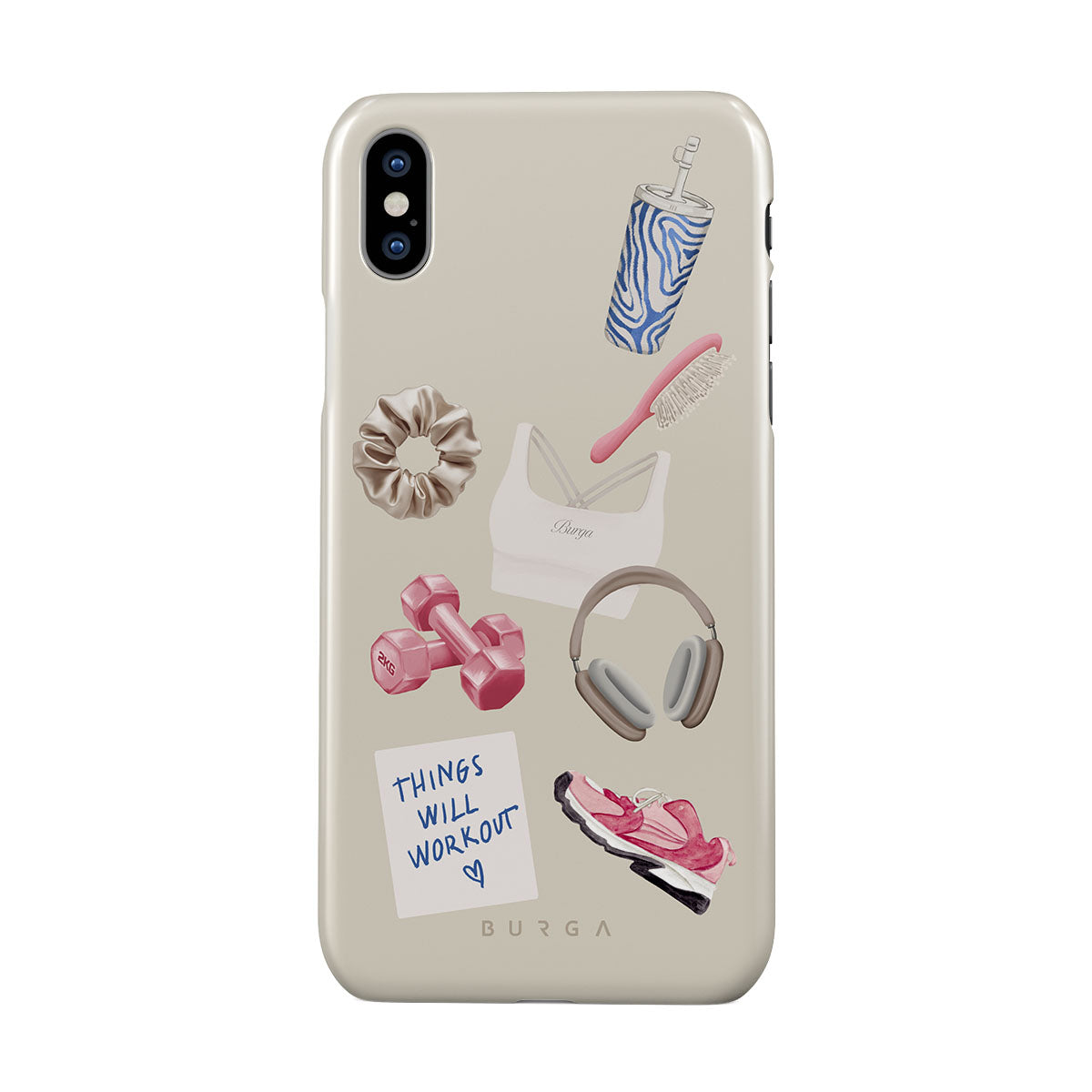 En este diseño: pesas, auriculares, termo, cepillo para el cabello, zapatillas rosas, sujetador deportivo, barrita Crunchie, nota adhesiva "Things Will Work Out".