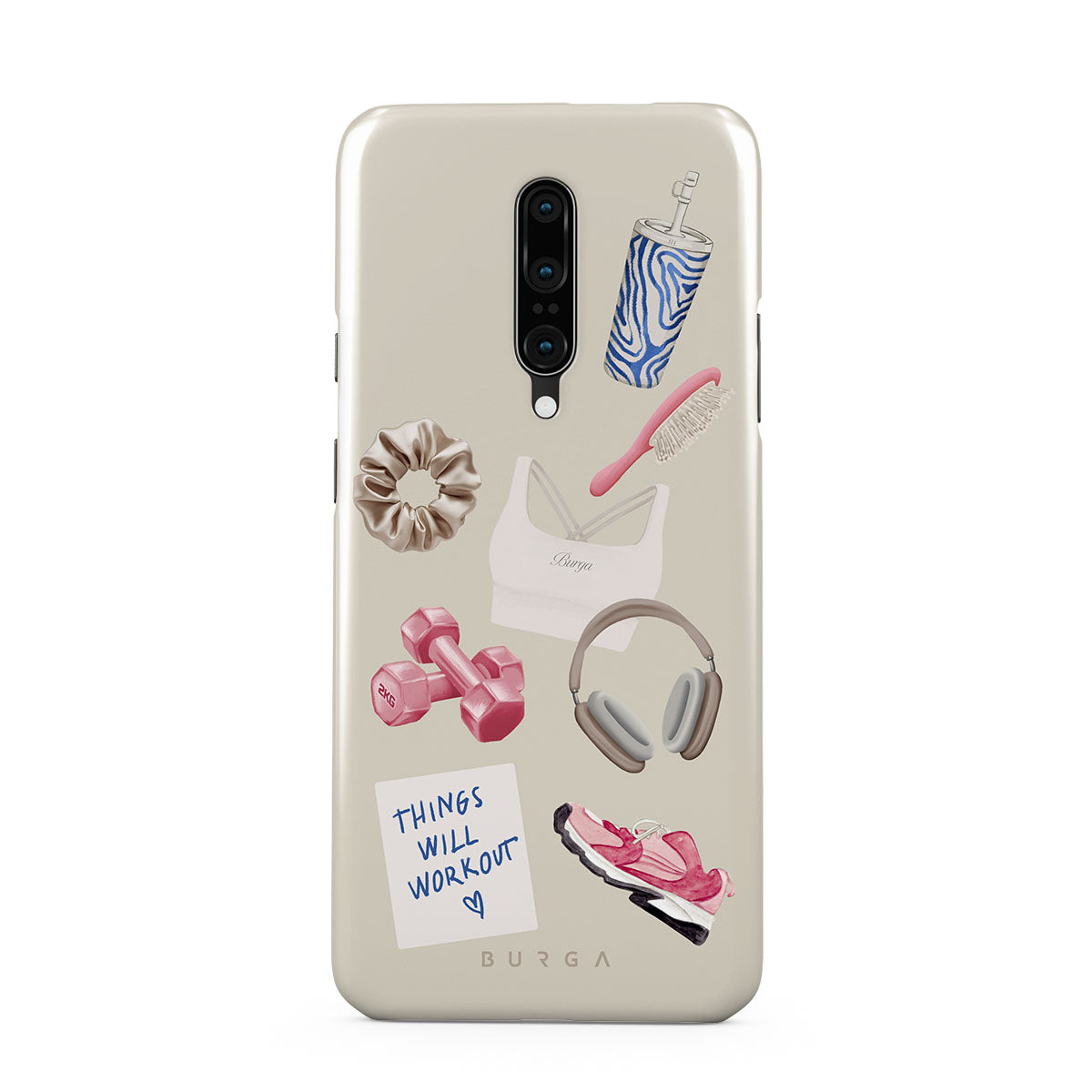 En este diseño: pesas, auriculares, termo, cepillo para el cabello, zapatillas rosas, sujetador deportivo, barrita Crunchie, nota adhesiva "Things Will Work Out".
