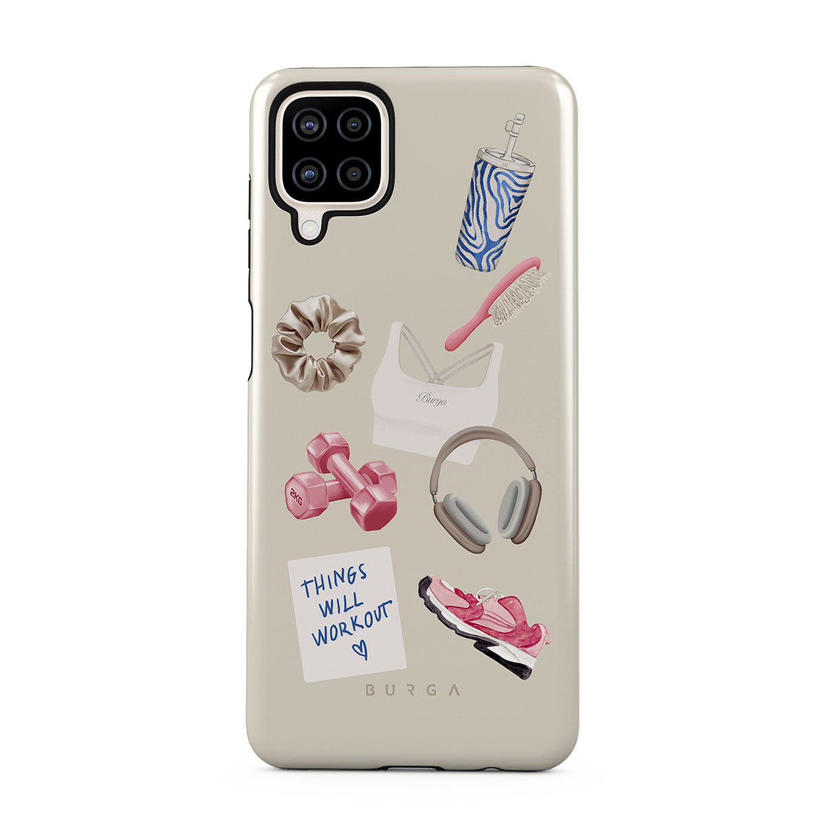 En este diseño: pesas, auriculares, termo, cepillo para el cabello, zapatillas rosas, sujetador deportivo, barrita Crunchie, nota adhesiva "Things Will Work Out".