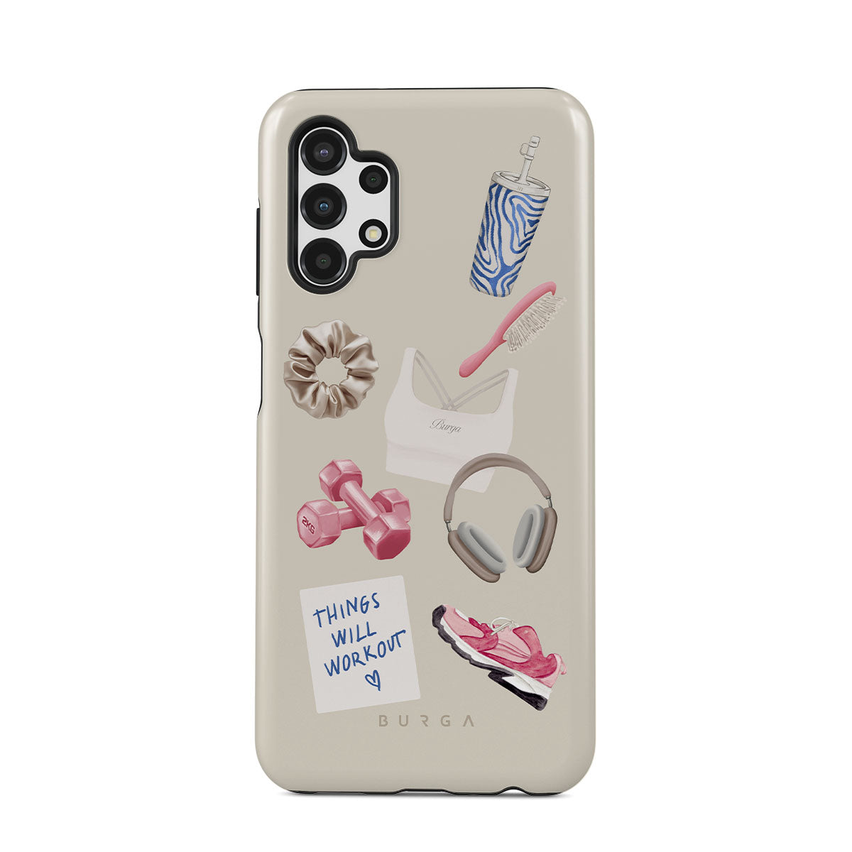En este diseño: pesas, auriculares, termo, cepillo para el cabello, zapatillas rosas, sujetador deportivo, barrita Crunchie, nota adhesiva "Things Will Work Out".