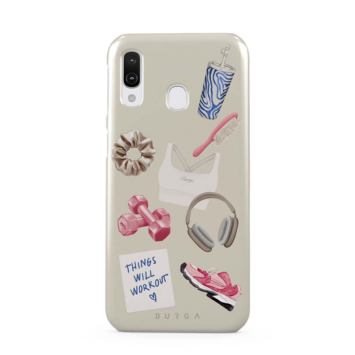 En este diseño: pesas, auriculares, termo, cepillo para el cabello, zapatillas rosas, sujetador deportivo, barrita Crunchie, nota adhesiva "Things Will Work Out".