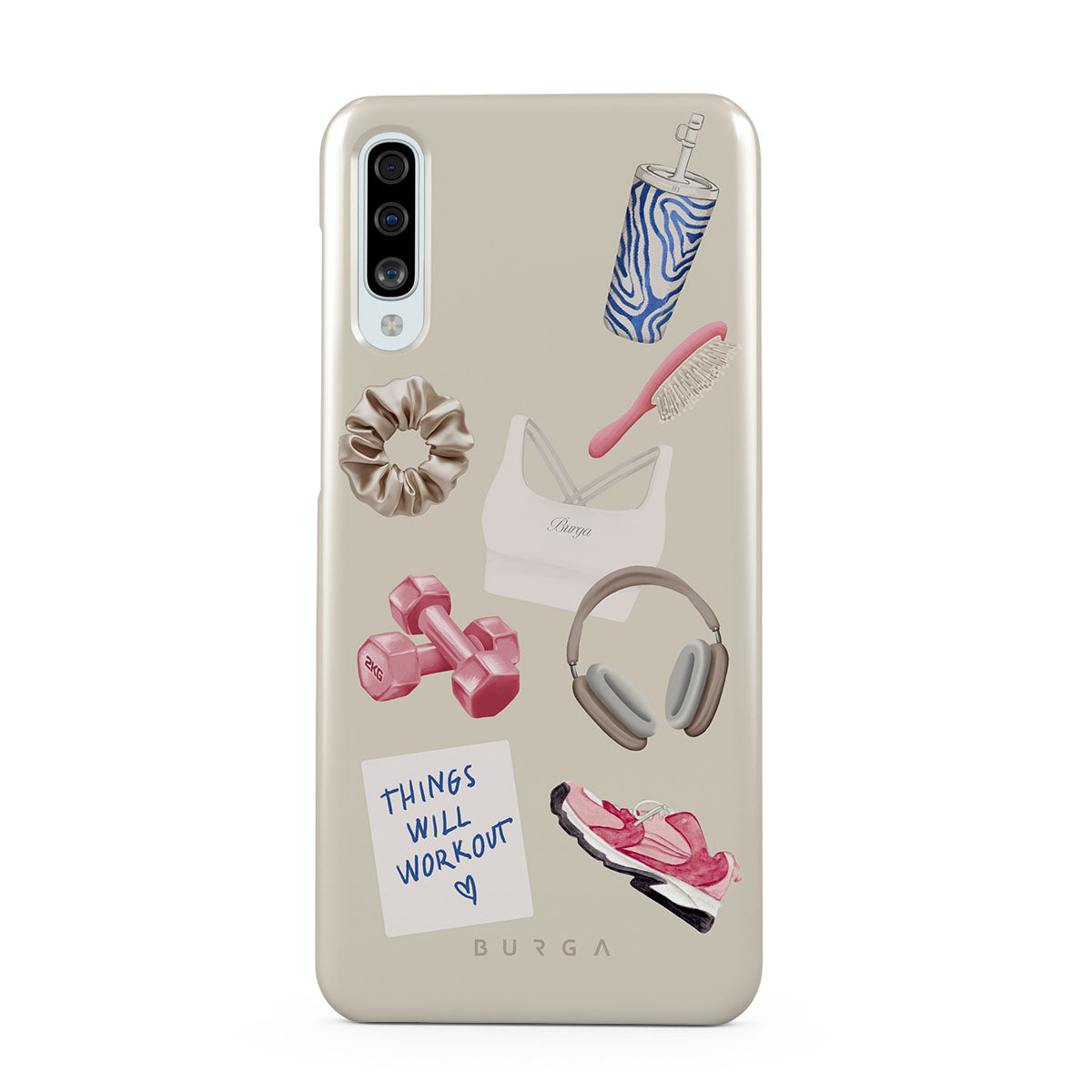 En este diseño: pesas, auriculares, termo, cepillo para el cabello, zapatillas rosas, sujetador deportivo, barrita Crunchie, nota adhesiva "Things Will Work Out".