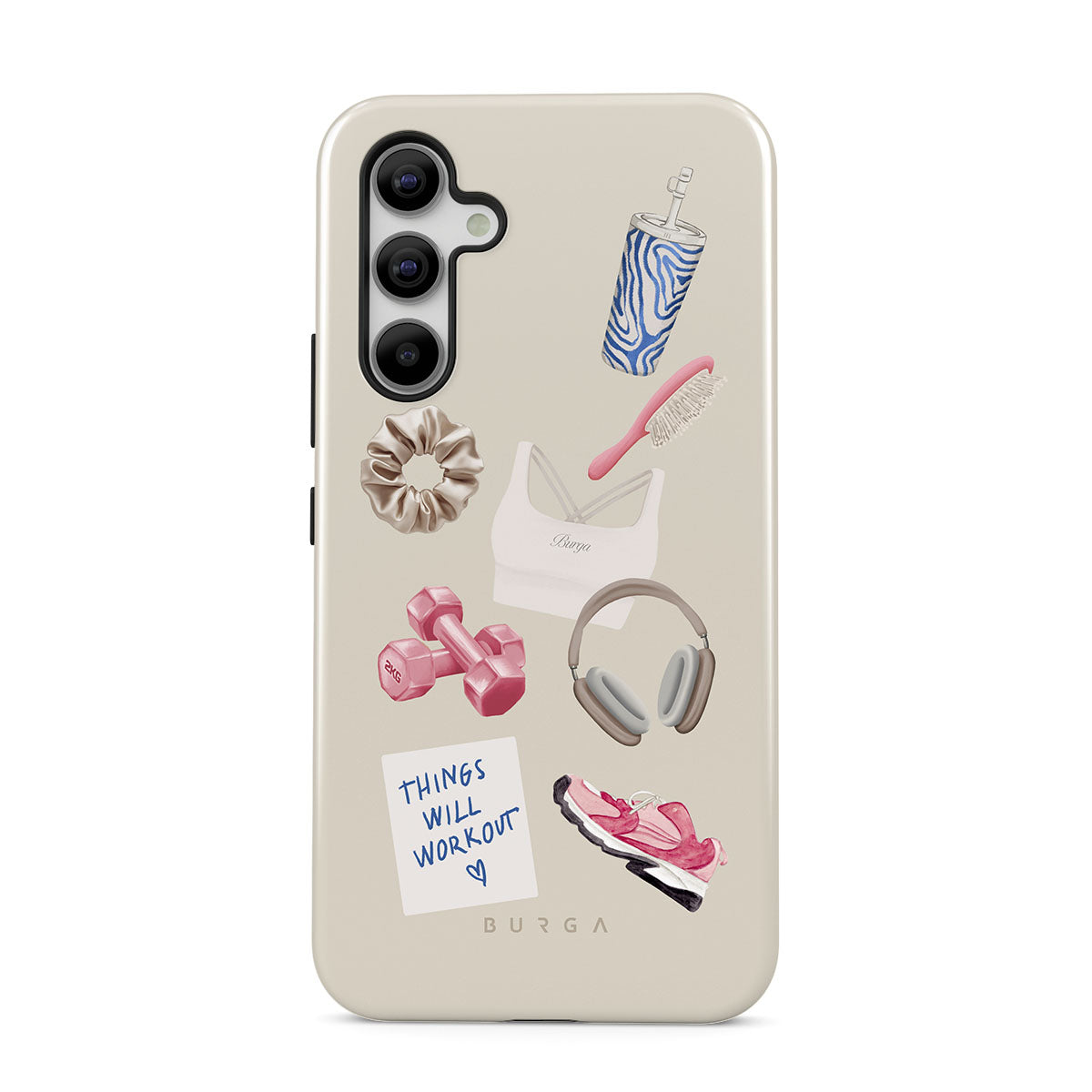 En este diseño: pesas, auriculares, termo, cepillo para el cabello, zapatillas rosas, sujetador deportivo, barrita Crunchie, nota adhesiva "Things Will Work Out".