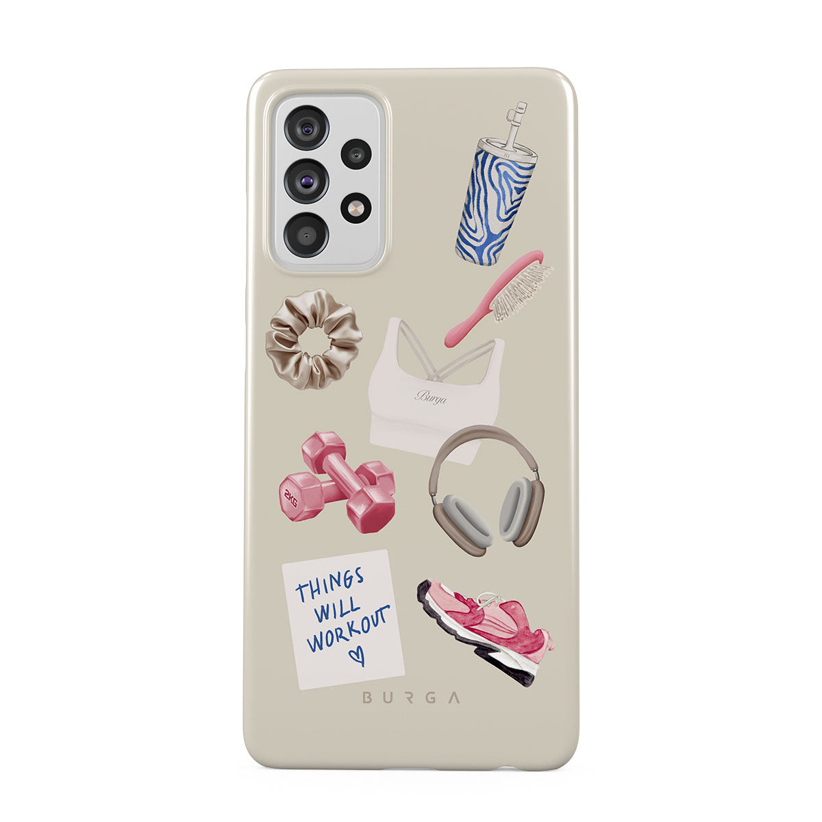 En este diseño: pesas, auriculares, termo, cepillo para el cabello, zapatillas rosas, sujetador deportivo, barrita Crunchie, nota adhesiva "Things Will Work Out".