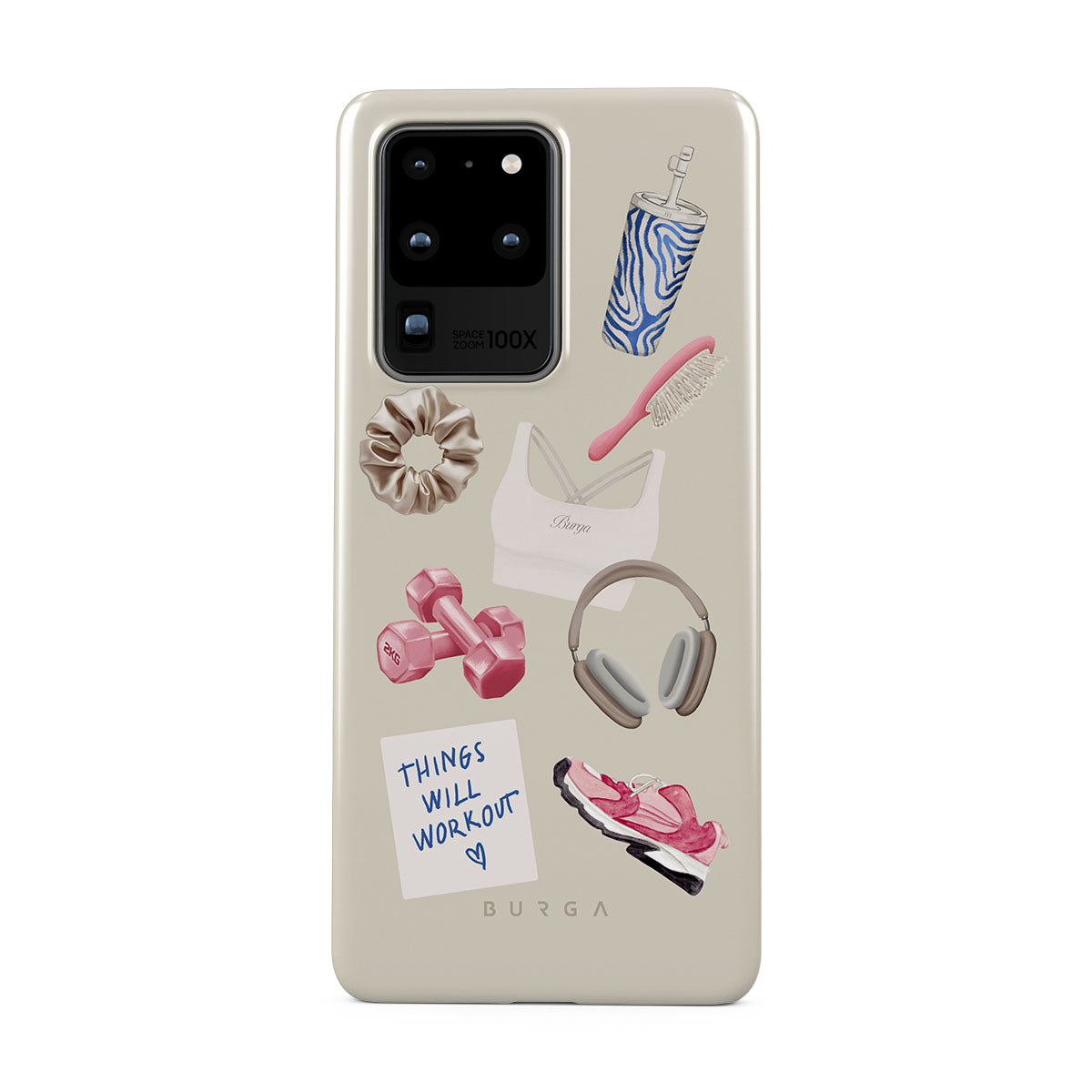 En este diseño: pesas, auriculares, termo, cepillo para el cabello, zapatillas rosas, sujetador deportivo, barrita Crunchie, nota adhesiva "Things Will Work Out".