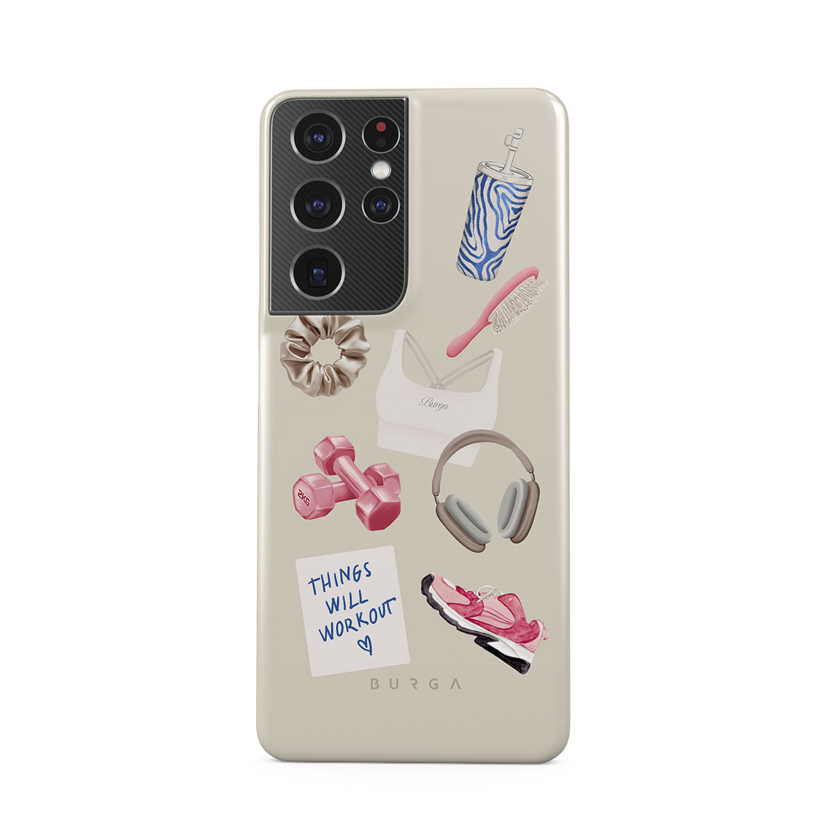 En este diseño: pesas, auriculares, termo, cepillo para el cabello, zapatillas rosas, sujetador deportivo, barrita Crunchie, nota adhesiva "Things Will Work Out".