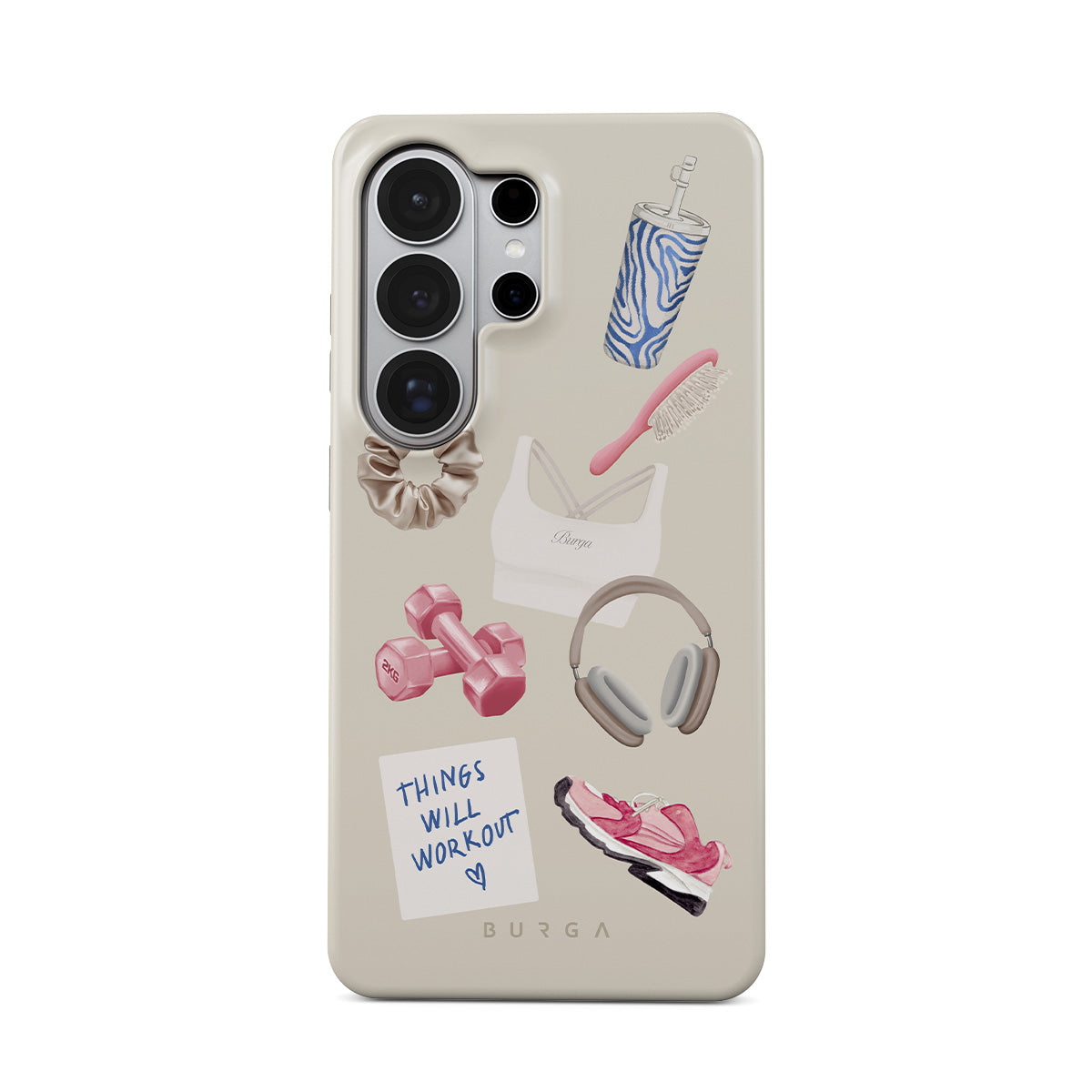 En este diseño: pesas, auriculares, termo, cepillo para el cabello, zapatillas rosas, sujetador deportivo, barrita Crunchie, nota adhesiva "Things Will Work Out".