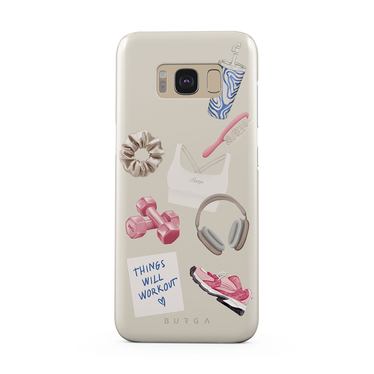En este diseño: pesas, auriculares, termo, cepillo para el cabello, zapatillas rosas, sujetador deportivo, barrita Crunchie, nota adhesiva "Things Will Work Out".