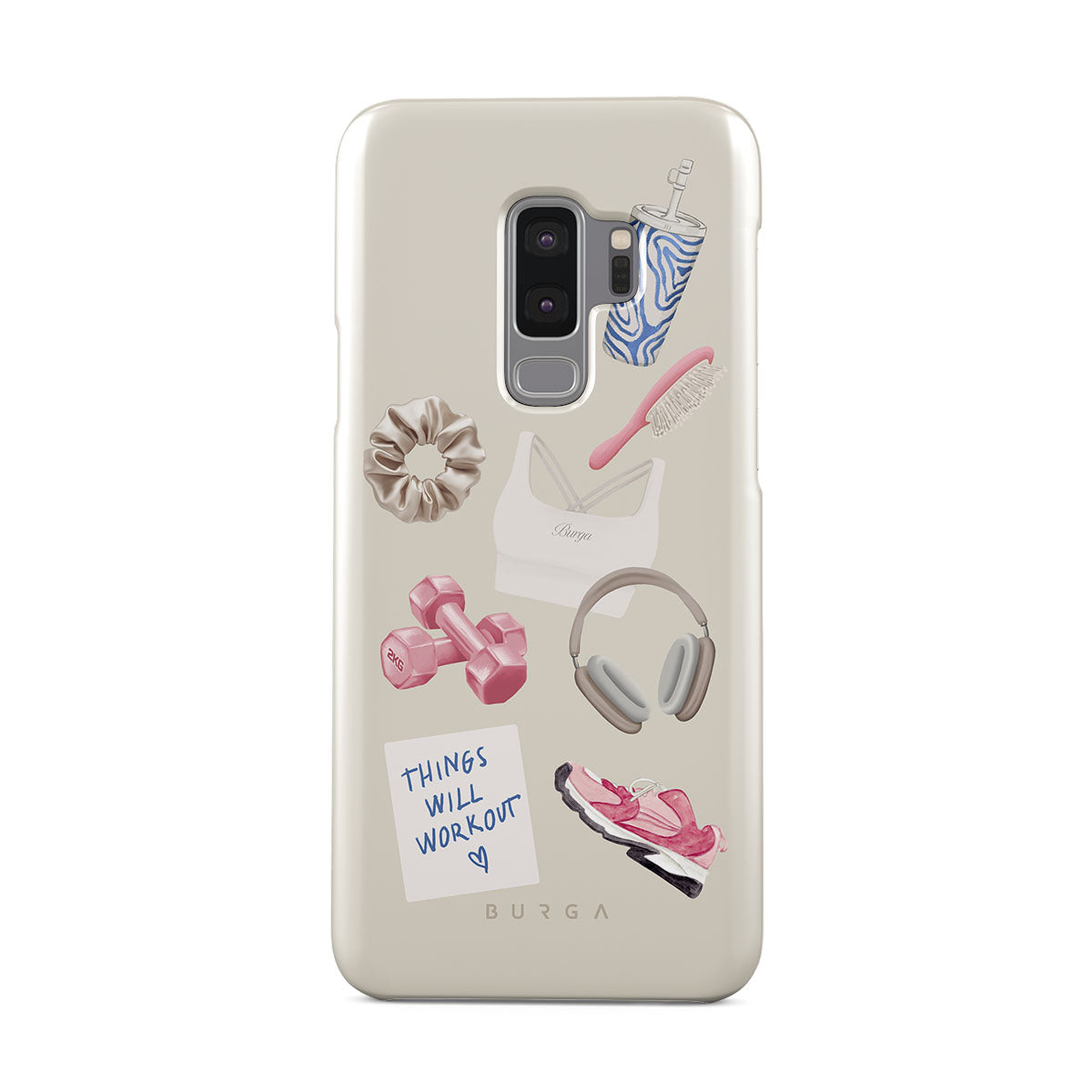 En este diseño: pesas, auriculares, termo, cepillo para el cabello, zapatillas rosas, sujetador deportivo, barrita Crunchie, nota adhesiva "Things Will Work Out".