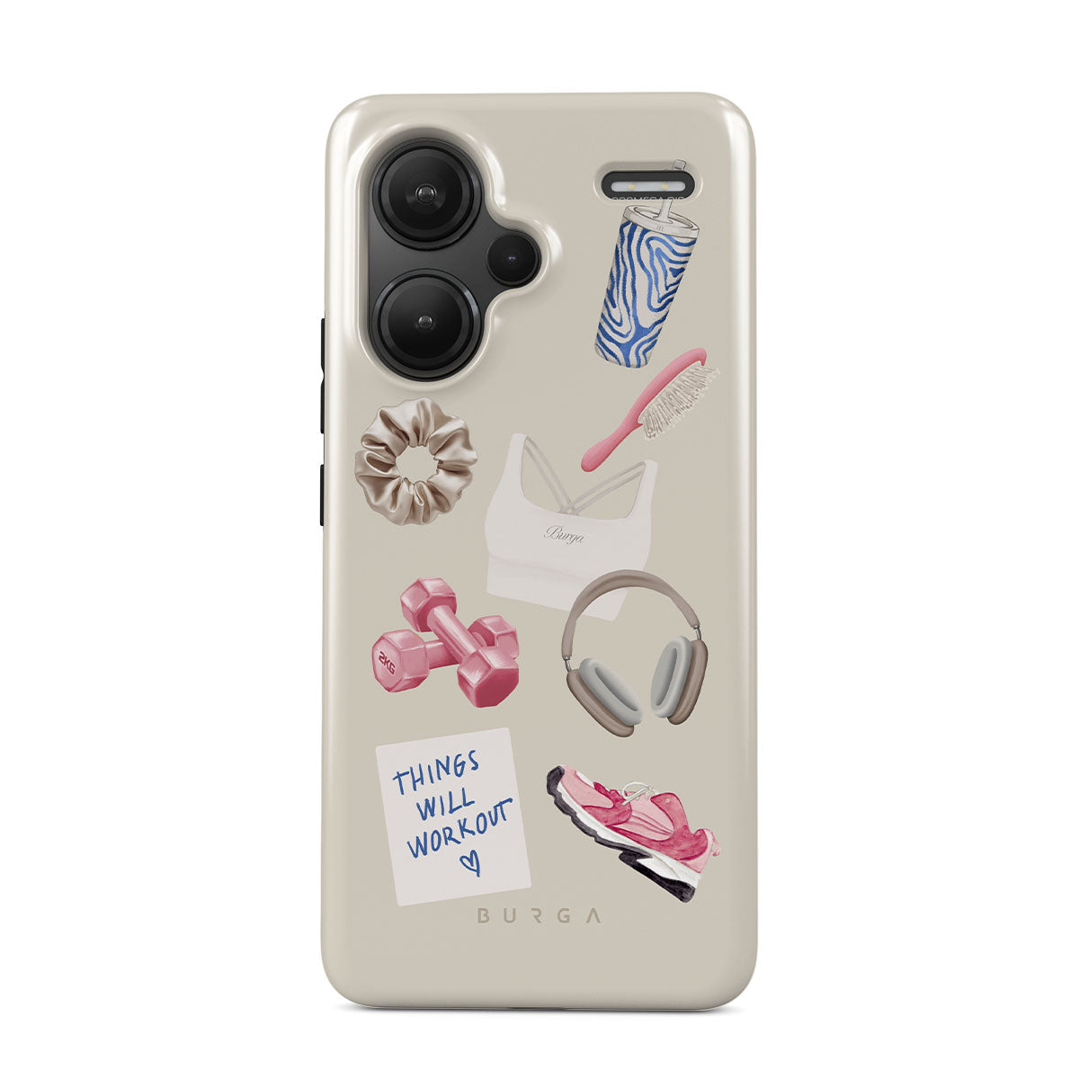 En este diseño: pesas, auriculares, termo, cepillo para el cabello, zapatillas rosas, sujetador deportivo, barrita Crunchie, nota adhesiva "Things Will Work Out".