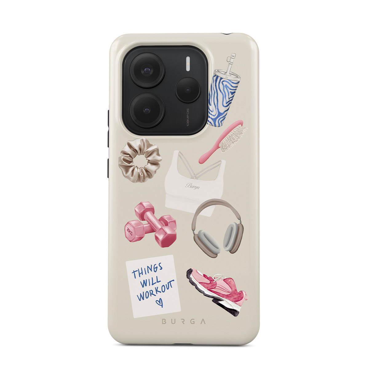 En este diseño: pesas, auriculares, termo, cepillo para el cabello, zapatillas rosas, sujetador deportivo, barrita Crunchie, nota adhesiva "Things Will Work Out".