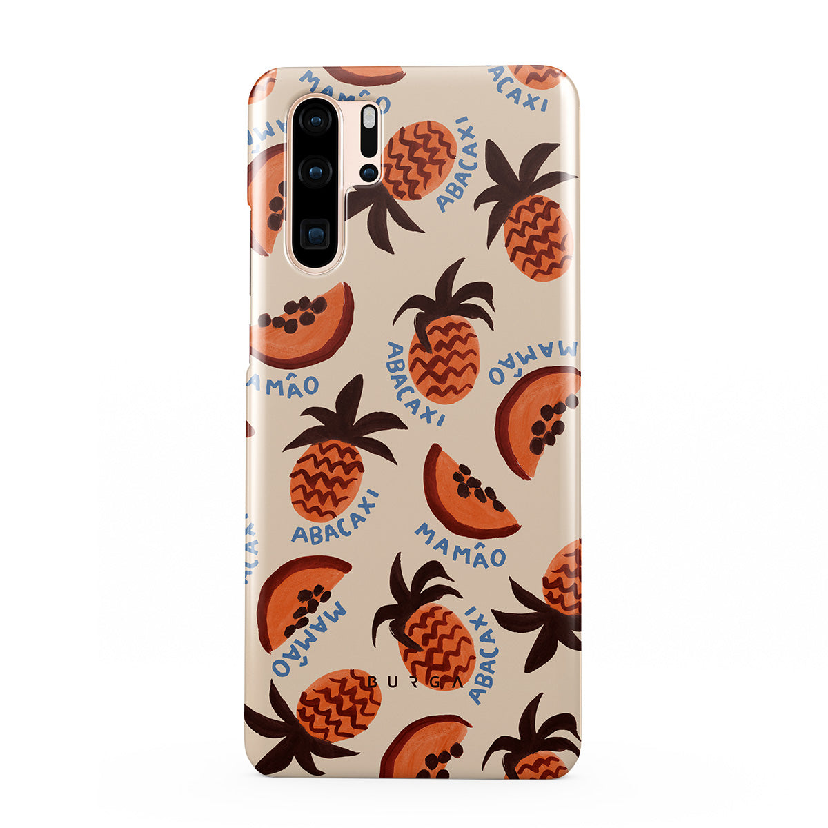 En este diseño: piña, papaya, patrón tropical