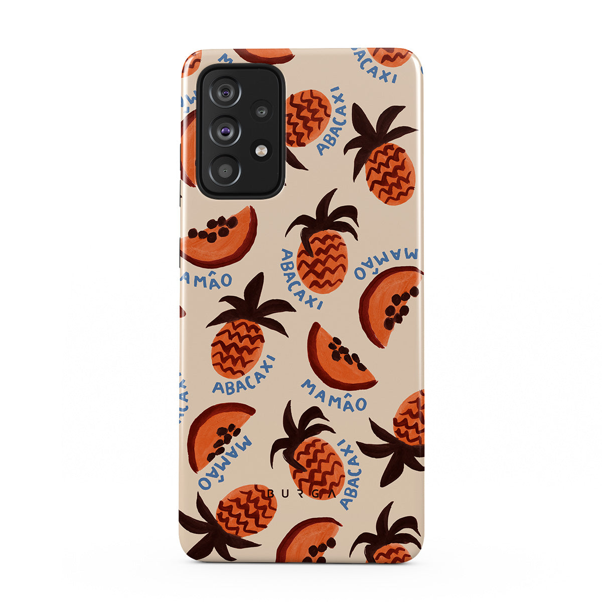 En este diseño: piña, papaya, patrón tropical
