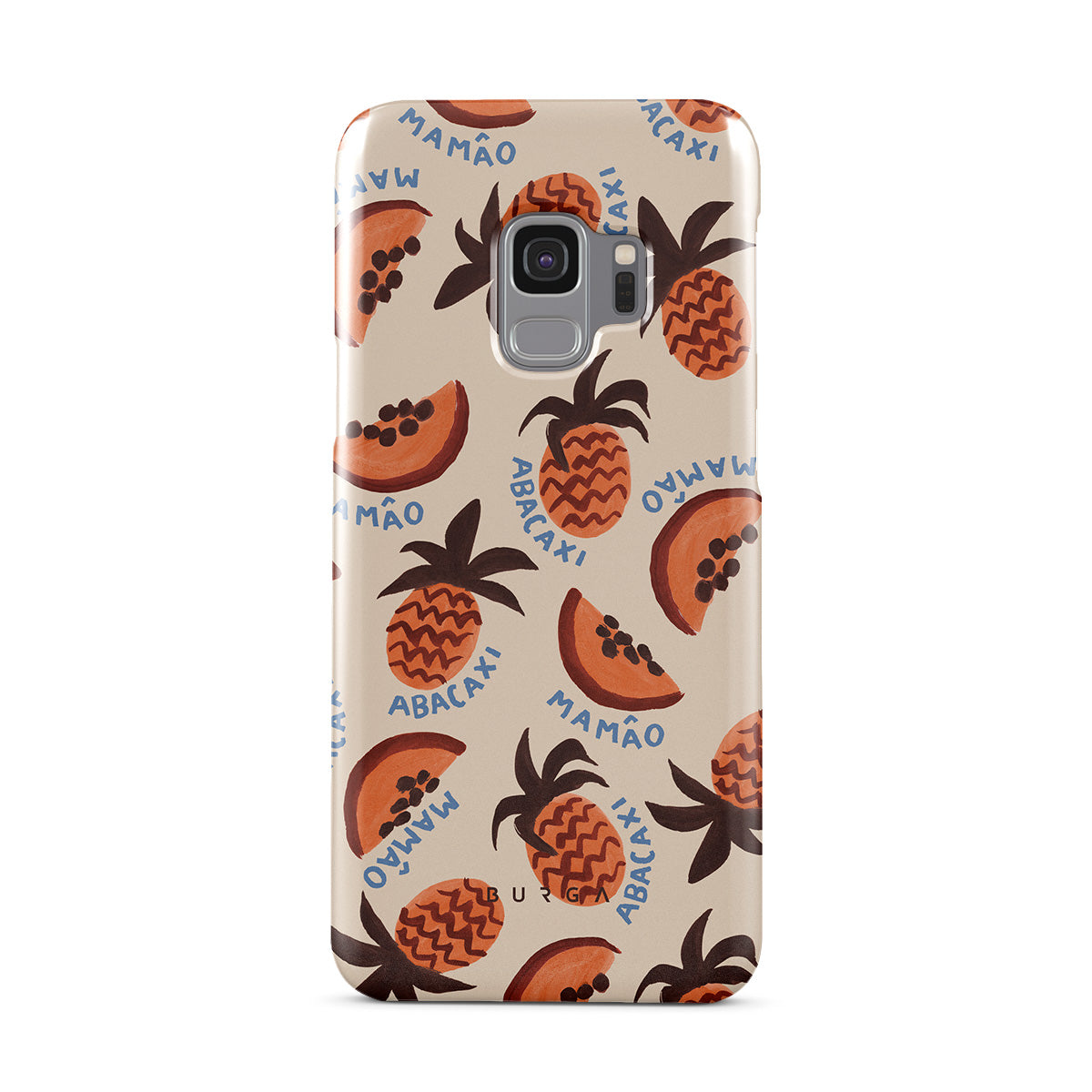 En este diseño: piña, papaya, patrón tropical