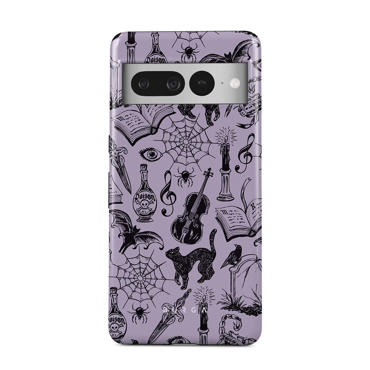 En este diseño: garabatos góticos, elementos místicos, arañas, telaraña, gato, violín, ojo, vela, daga, libro, murciélago, cuervo, escorpión