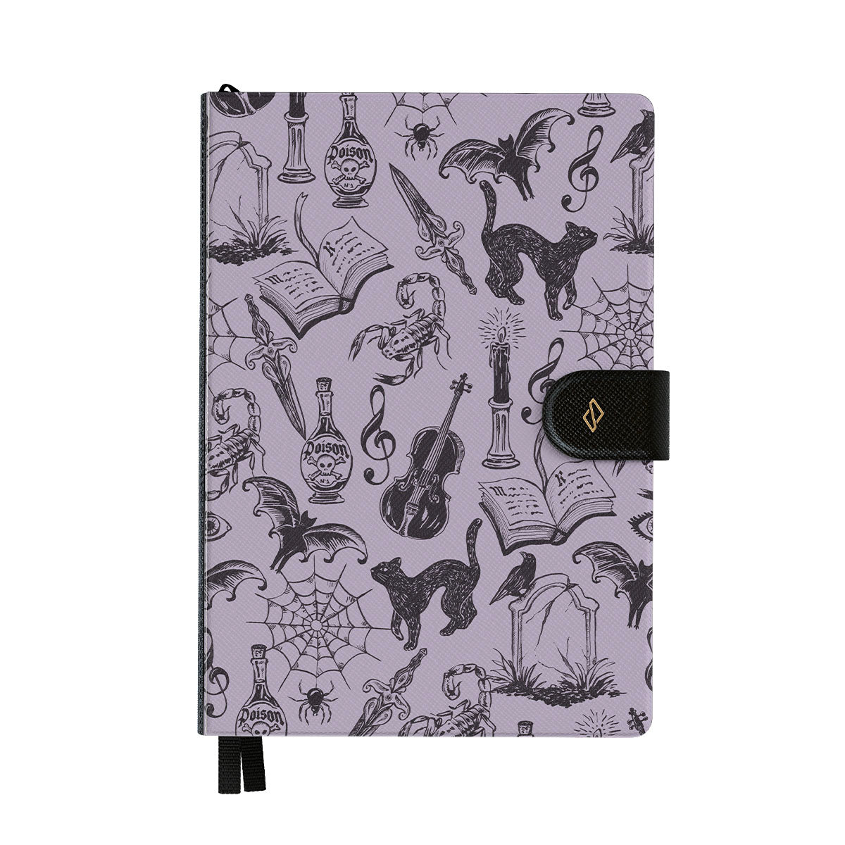 En este diseño: garabatos góticos, elementos místicos, arañas, telaraña, gato, violín, ojo, vela, daga, libro, murciélago, cuervo, escorpión