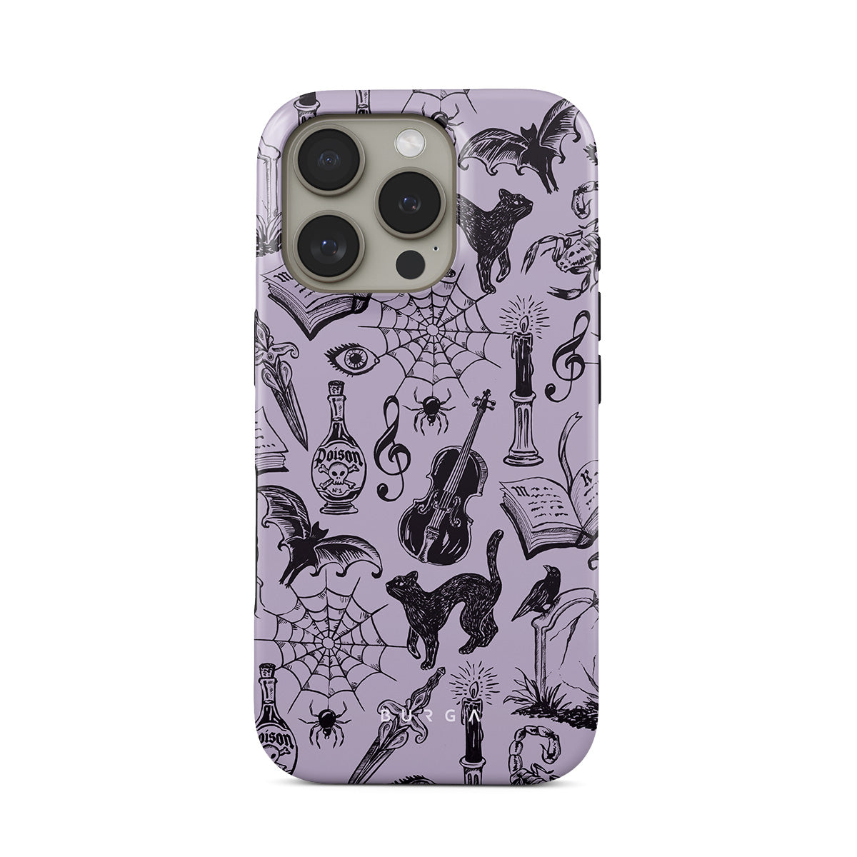 En este diseño: garabatos góticos, elementos místicos, arañas, telaraña, gato, violín, ojo, vela, daga, libro, murciélago, cuervo, escorpión