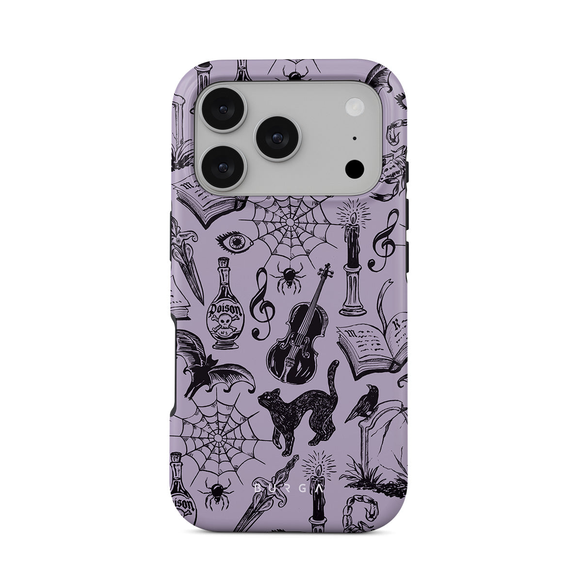 En este diseño: garabatos góticos, elementos místicos, arañas, telaraña, gato, violín, ojo, vela, daga, libro, murciélago, cuervo, escorpión