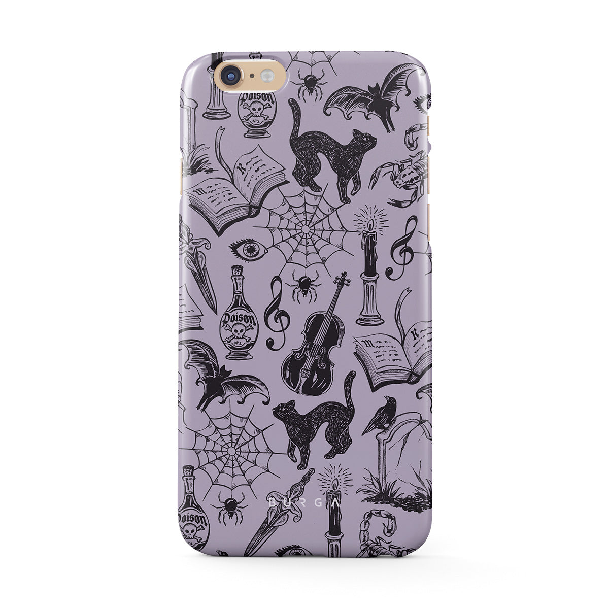 En este diseño: garabatos góticos, elementos místicos, arañas, telaraña, gato, violín, ojo, vela, daga, libro, murciélago, cuervo, escorpión