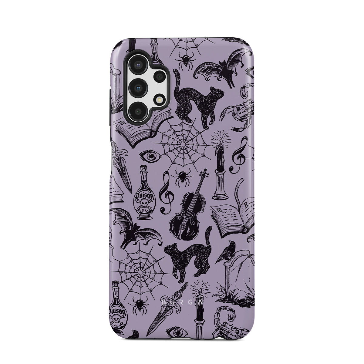 En este diseño: garabatos góticos, elementos místicos, arañas, telaraña, gato, violín, ojo, vela, daga, libro, murciélago, cuervo, escorpión