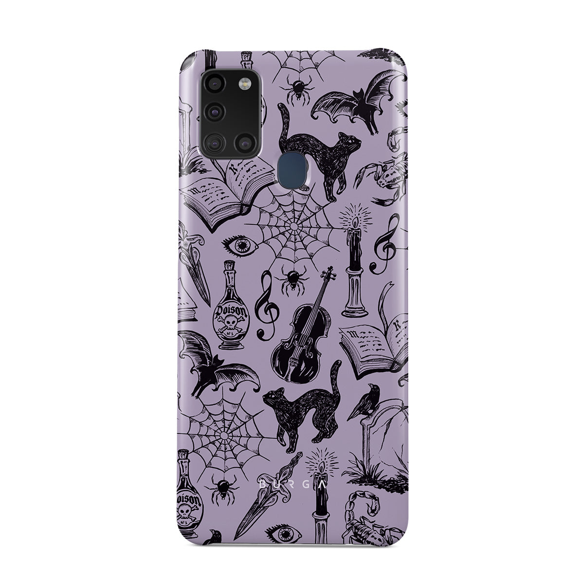 En este diseño: garabatos góticos, elementos místicos, arañas, telaraña, gato, violín, ojo, vela, daga, libro, murciélago, cuervo, escorpión