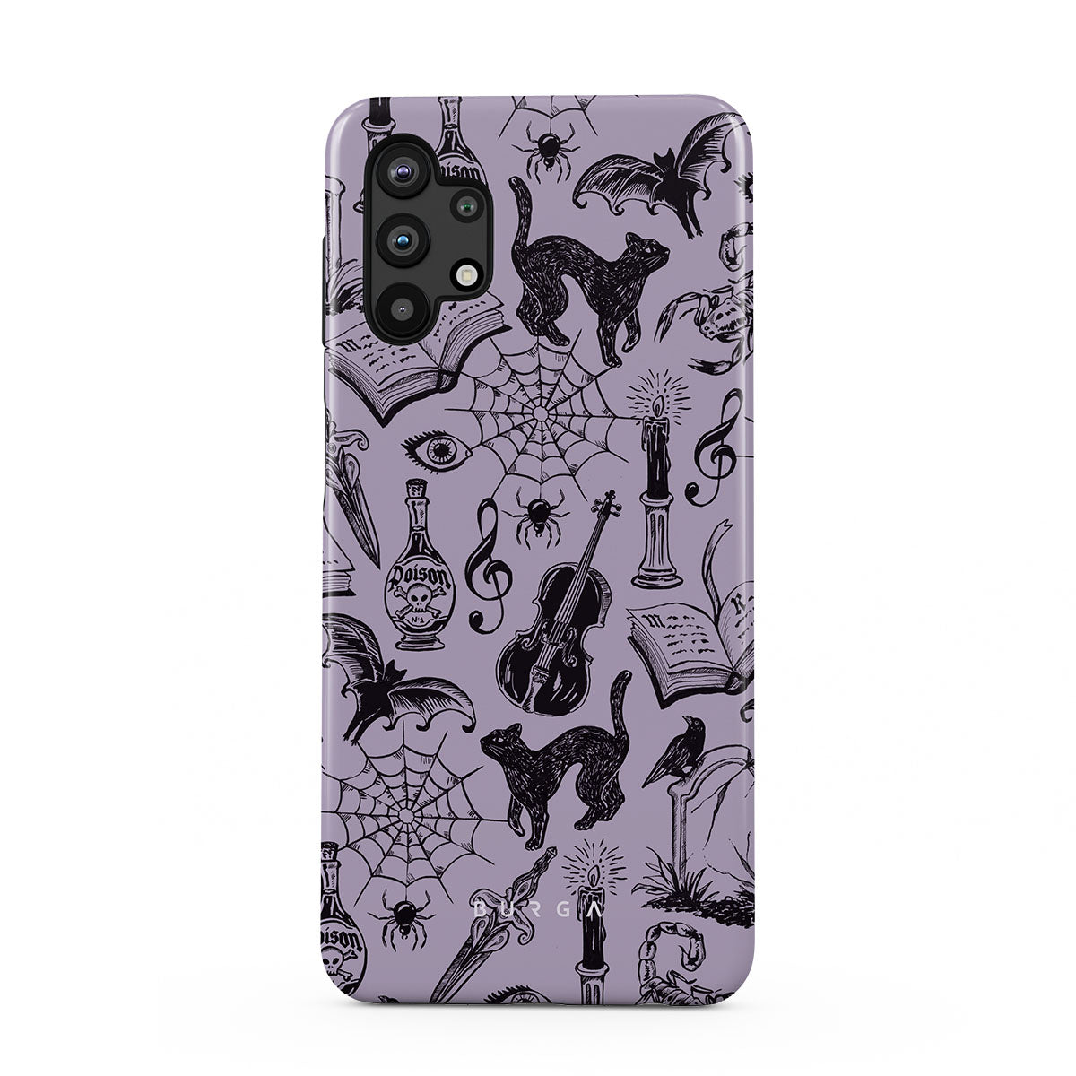 En este diseño: garabatos góticos, elementos místicos, arañas, telaraña, gato, violín, ojo, vela, daga, libro, murciélago, cuervo, escorpión