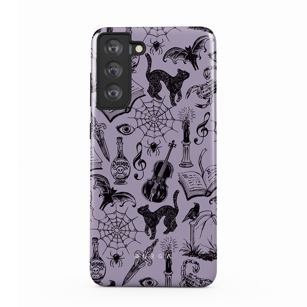 En este diseño: garabatos góticos, elementos místicos, arañas, telaraña, gato, violín, ojo, vela, daga, libro, murciélago, cuervo, escorpión
