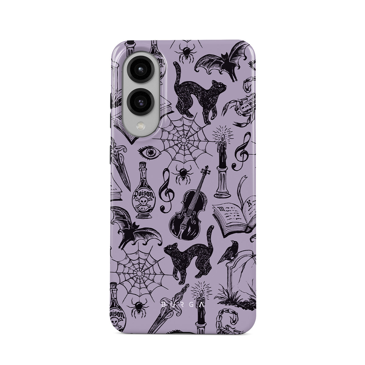 En este diseño: garabatos góticos, elementos místicos, arañas, telaraña, gato, violín, ojo, vela, daga, libro, murciélago, cuervo, escorpión