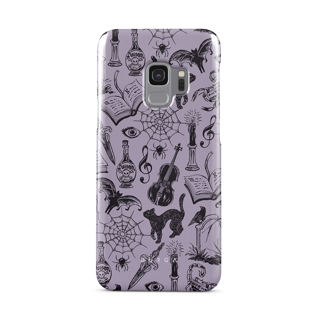 En este diseño: garabatos góticos, elementos místicos, arañas, telaraña, gato, violín, ojo, vela, daga, libro, murciélago, cuervo, escorpión
