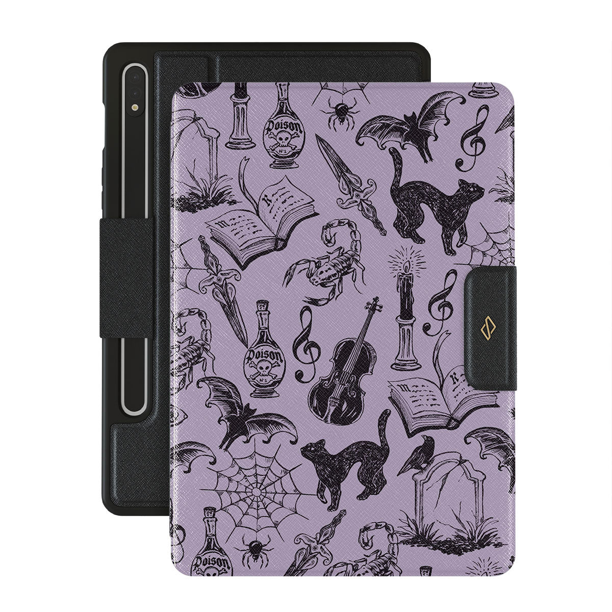 En este diseño: garabatos góticos, elementos místicos, arañas, telaraña, gato, violín, ojo, vela, daga, libro, murciélago, cuervo, escorpión