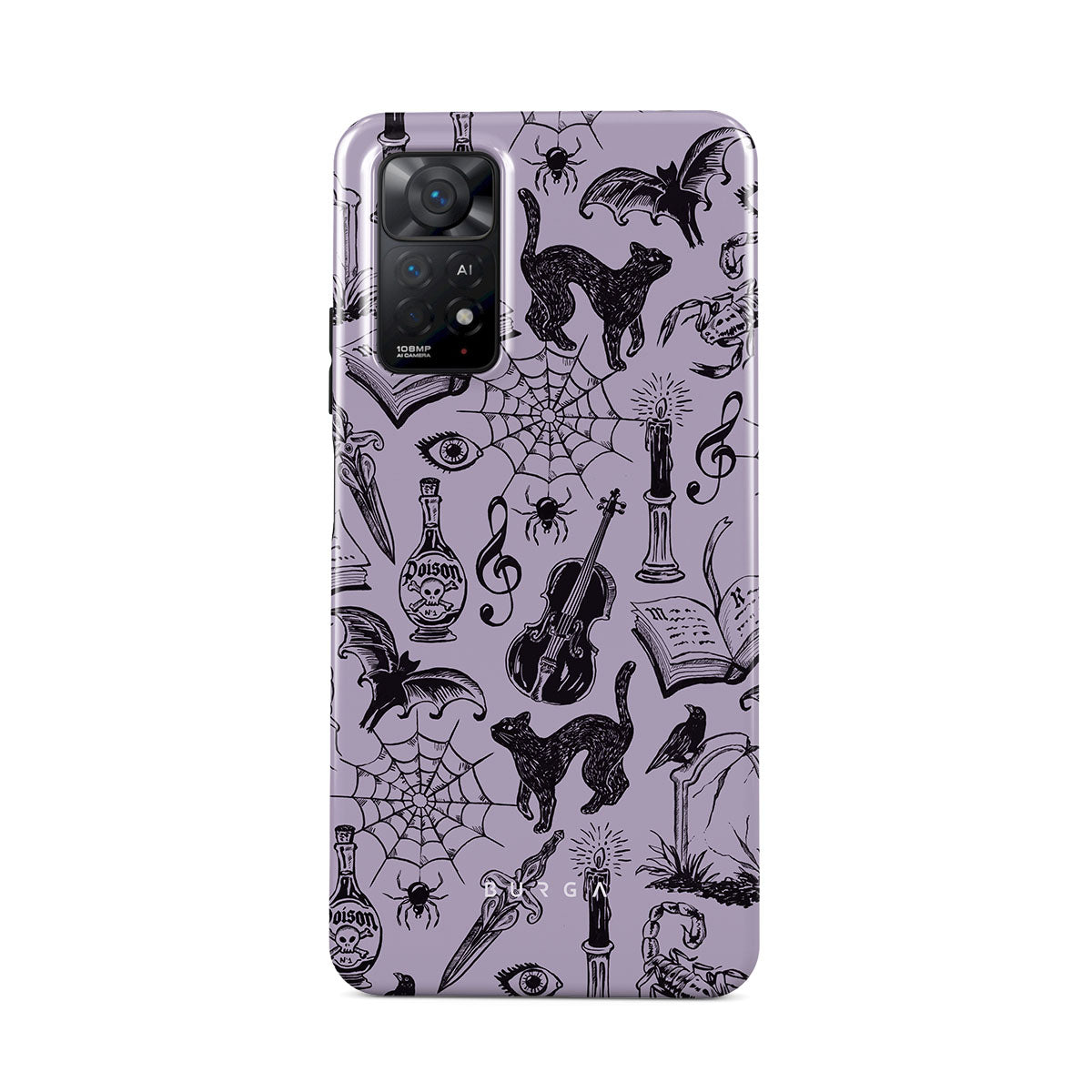 En este diseño: garabatos góticos, elementos místicos, arañas, telaraña, gato, violín, ojo, vela, daga, libro, murciélago, cuervo, escorpión
