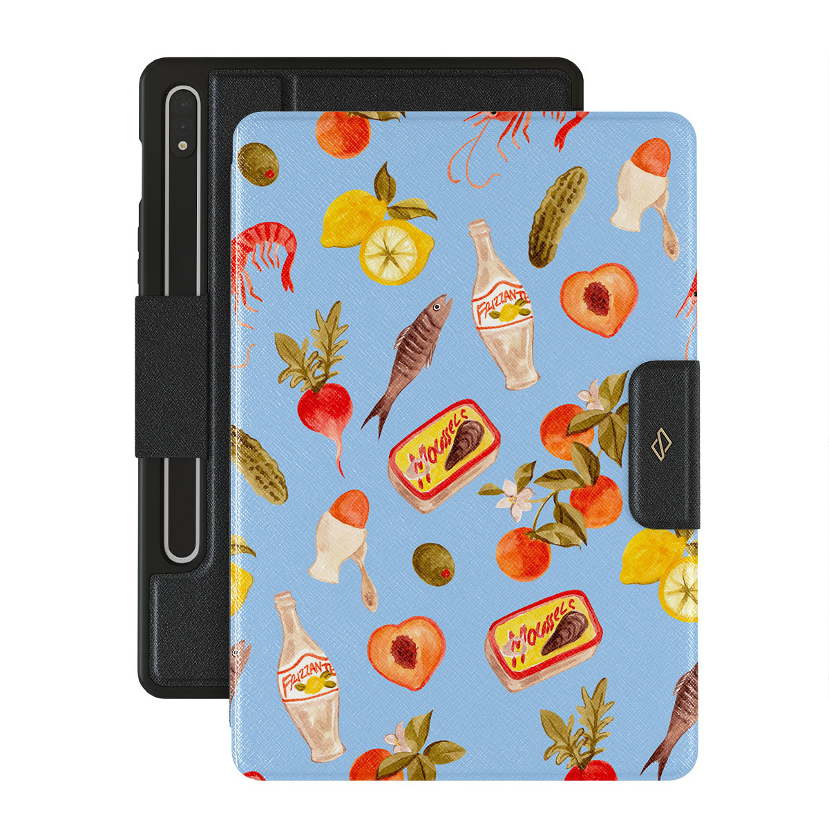 En este diseño: Cangrejos de río, cítricos, picnic, limón, huevo, pepinillos, vegetación fresca, elementos de playa, durazno, flor, oliva.