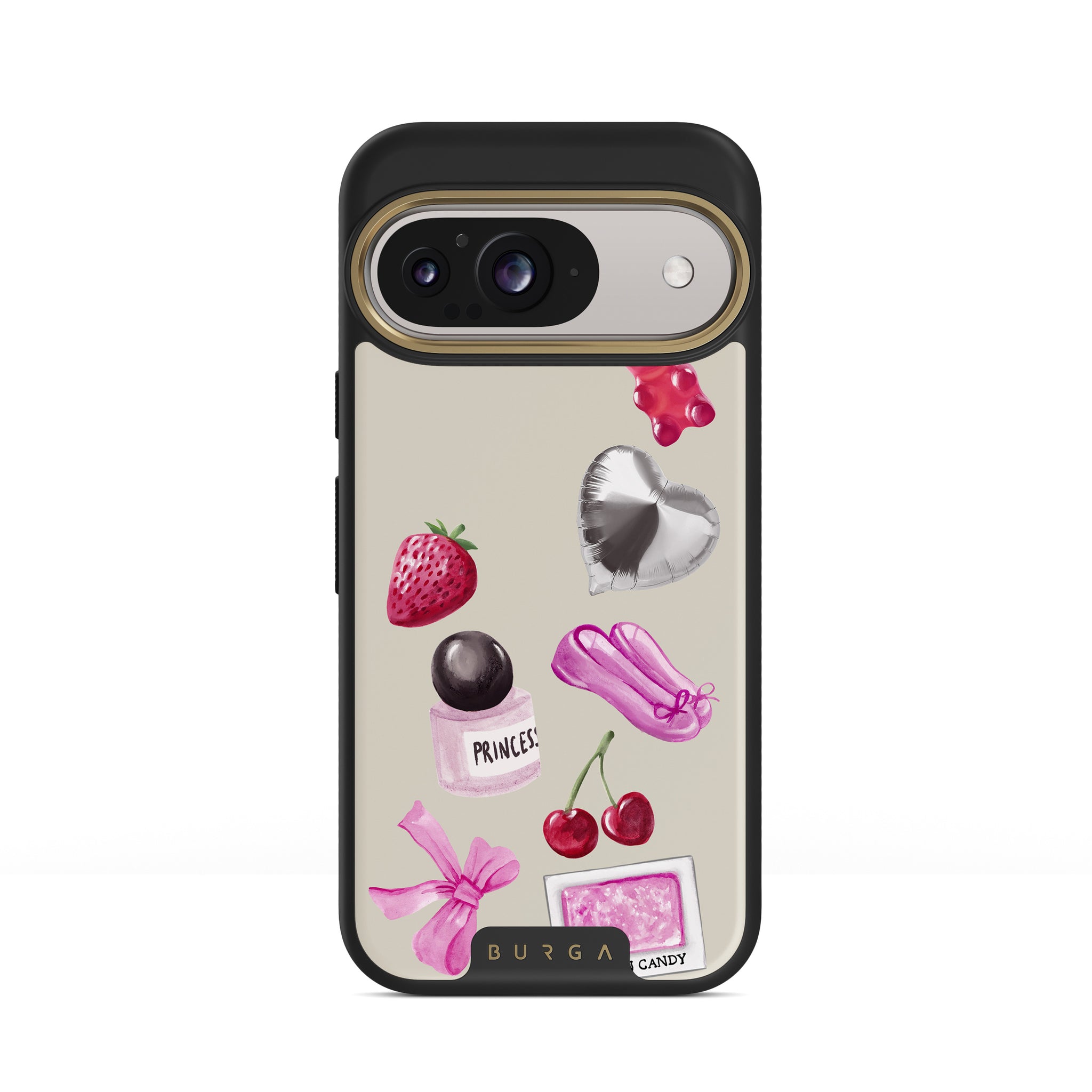 En este diseño: lazo rosa, globo plateado en forma de corazón, frasco de perfume, fresa, cerezas, zapatillas de ballet rosas, sticker de algodón de azúcar, osito de goma rosa.