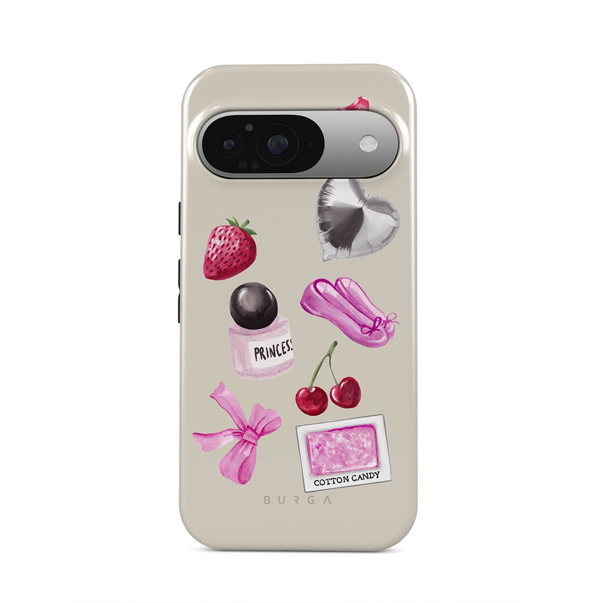 En este diseño: lazo rosa, globo plateado en forma de corazón, frasco de perfume, fresa, cerezas, zapatillas de ballet rosas, sticker de algodón de azúcar, osito de goma rosa.