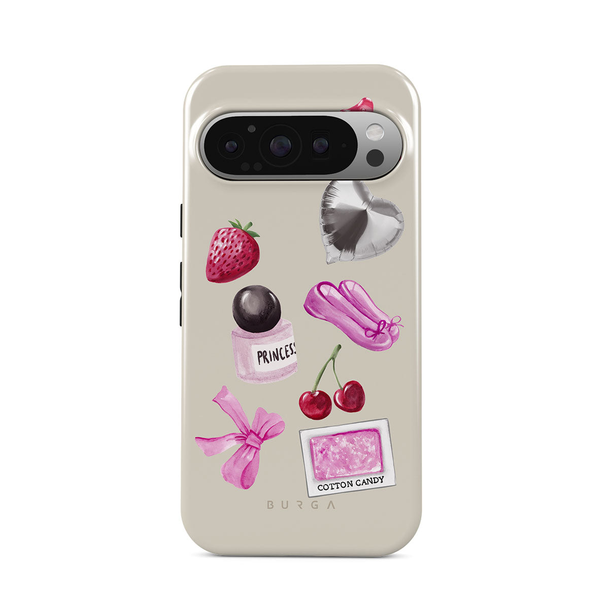 En este diseño: lazo rosa, globo plateado en forma de corazón, frasco de perfume, fresa, cerezas, zapatillas de ballet rosas, sticker de algodón de azúcar, osito de goma rosa.