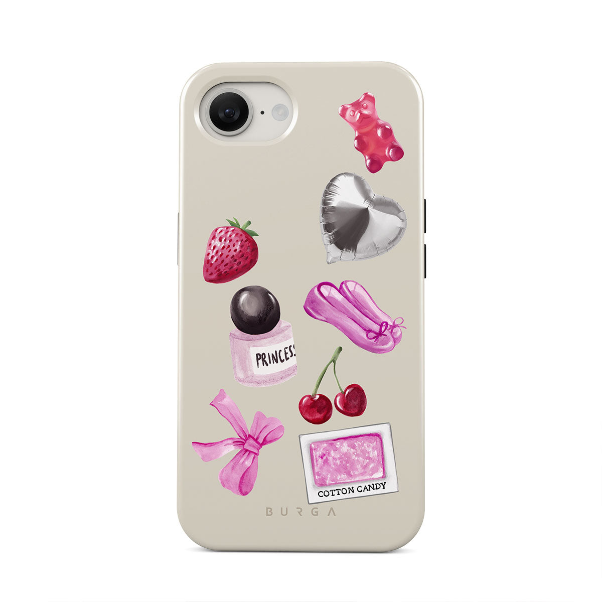 En este diseño: lazo rosa, globo plateado en forma de corazón, frasco de perfume, fresa, cerezas, zapatillas de ballet rosas, sticker de algodón de azúcar, osito de goma rosa.