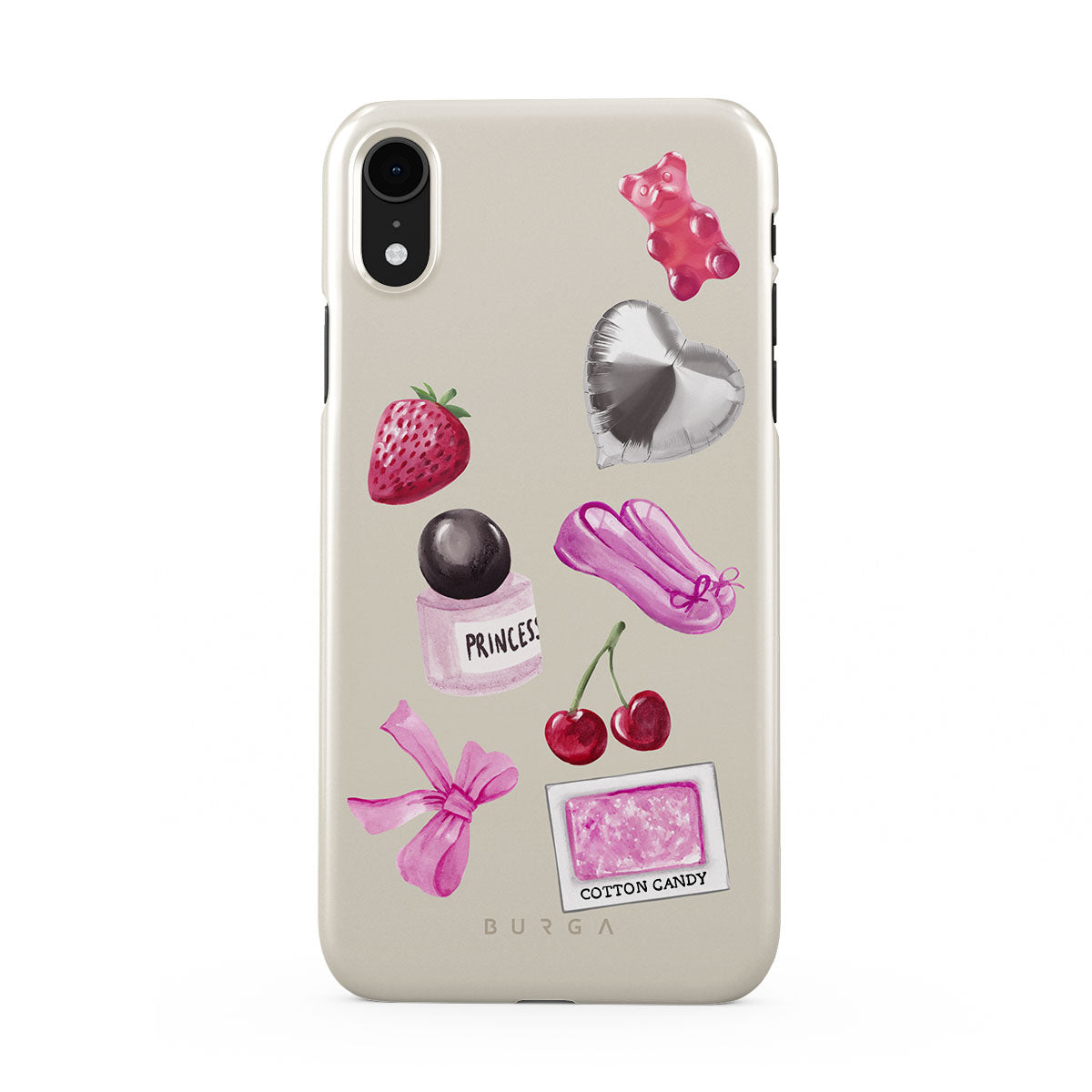 En este diseño: lazo rosa, globo plateado en forma de corazón, frasco de perfume, fresa, cerezas, zapatillas de ballet rosas, sticker de algodón de azúcar, osito de goma rosa.