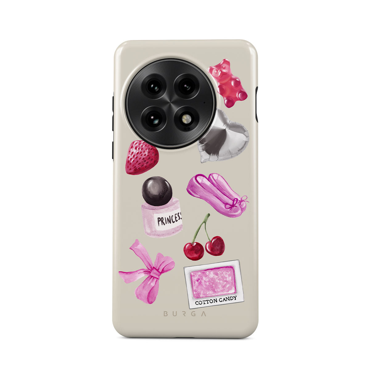 En este diseño: lazo rosa, globo plateado en forma de corazón, frasco de perfume, fresa, cerezas, zapatillas de ballet rosas, sticker de algodón de azúcar, osito de goma rosa.