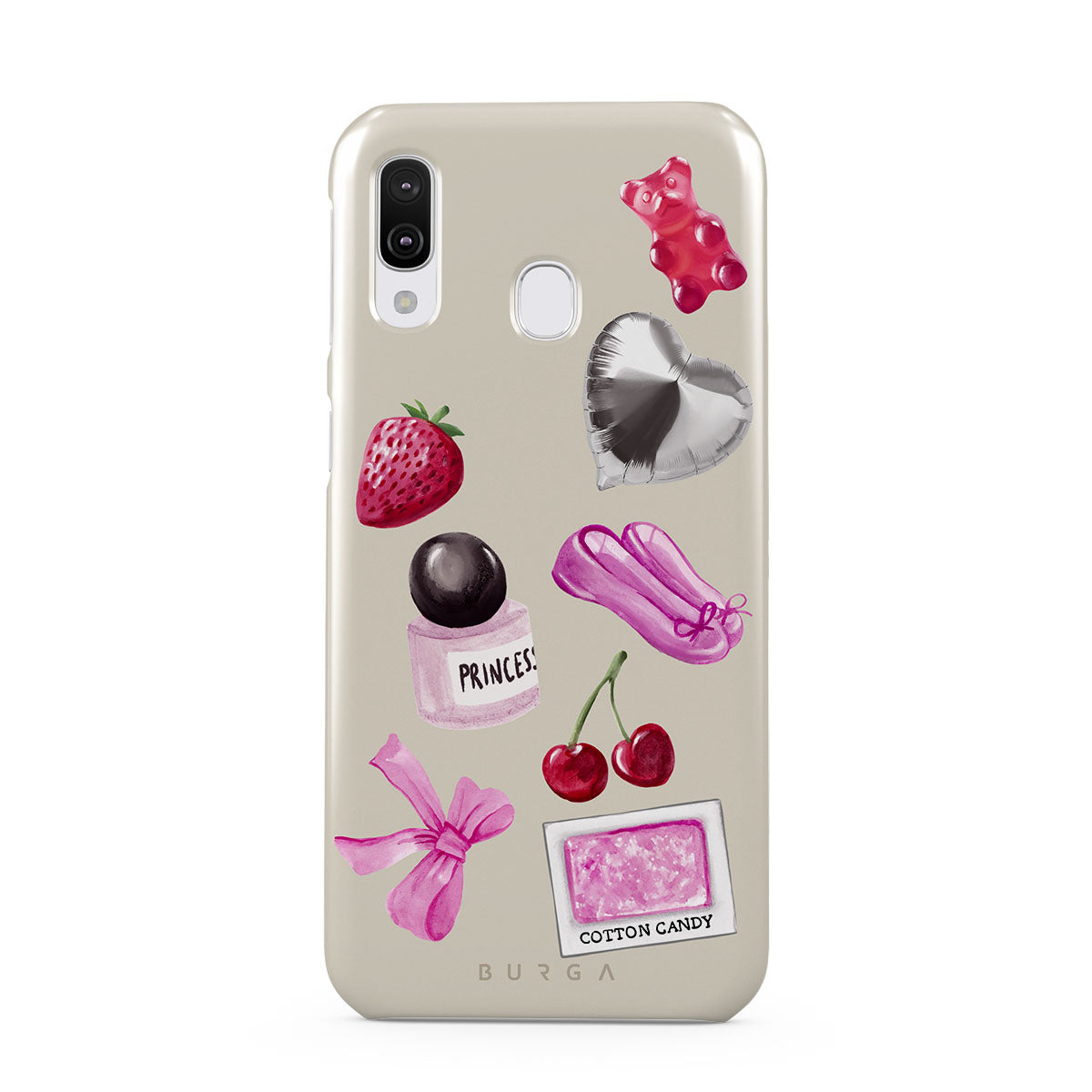 En este diseño: lazo rosa, globo plateado en forma de corazón, frasco de perfume, fresa, cerezas, zapatillas de ballet rosas, sticker de algodón de azúcar, osito de goma rosa.