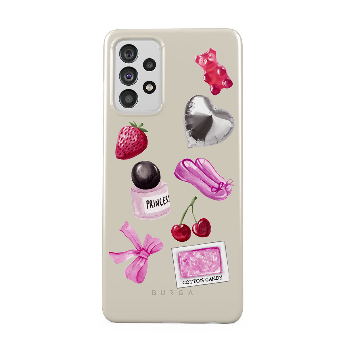 En este diseño: lazo rosa, globo plateado en forma de corazón, frasco de perfume, fresa, cerezas, zapatillas de ballet rosas, sticker de algodón de azúcar, osito de goma rosa.