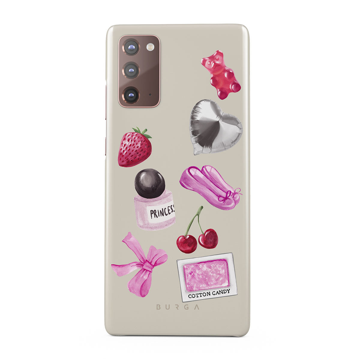 En este diseño: lazo rosa, globo plateado en forma de corazón, frasco de perfume, fresa, cerezas, zapatillas de ballet rosas, sticker de algodón de azúcar, osito de goma rosa.