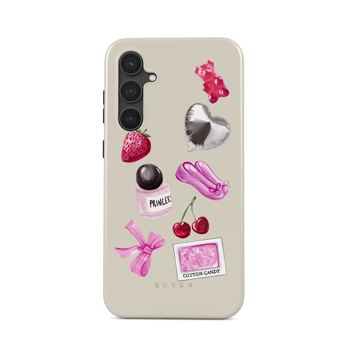 En este diseño: lazo rosa, globo plateado en forma de corazón, frasco de perfume, fresa, cerezas, zapatillas de ballet rosas, sticker de algodón de azúcar, osito de goma rosa.