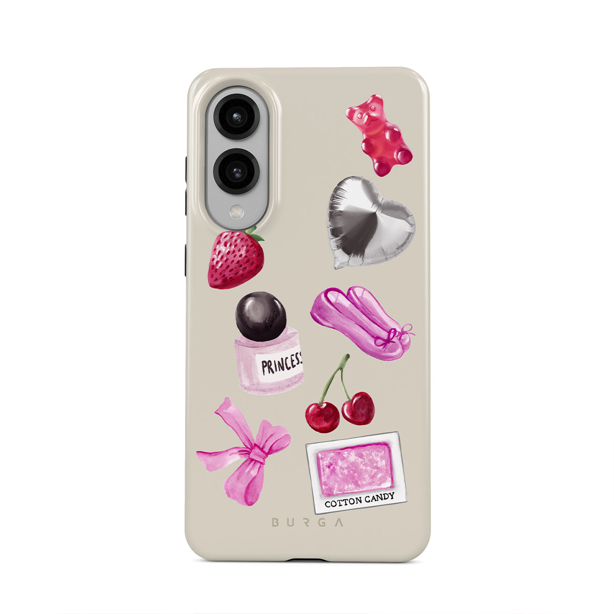 En este diseño: lazo rosa, globo plateado en forma de corazón, frasco de perfume, fresa, cerezas, zapatillas de ballet rosas, sticker de algodón de azúcar, osito de goma rosa.