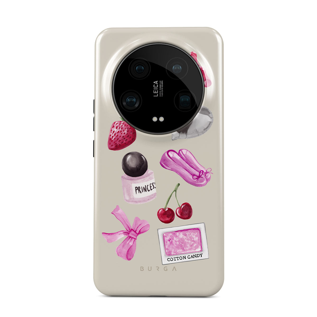 En este diseño: lazo rosa, globo plateado en forma de corazón, frasco de perfume, fresa, cerezas, zapatillas de ballet rosas, sticker de algodón de azúcar, osito de goma rosa.